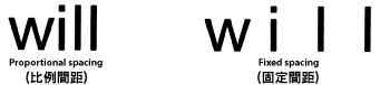 每一種字型中每個字元的寬度以一個確定的點數表示,和其他字元各不相同。例如,字母「W」比字母「I」寬。有兩種方式列印不同寬度的字母︰不管字母實際寬度如何,以相同間距列印所有字母;或者變更字母間距以容納不同的字母寬度。以相同間距列印所有字母稱為「Fixed spacing」(固定間距),變更字母間距以容納不同的字母寬度稱為「Proportional spacing」(比例間距)。