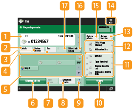 Mostra el nom de la destinació especificada, el número de fax, el nombre de destinacions i l'hora actual.