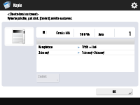 Rezervování kopieSkenování může být provedeno předem, dokonce i tehdy, když se stroj připravuje na tisk. Tato funkce se nazývá „Rezervovaná kopie“. Chcete-li například provést zpracování rezervované kopie, když je na displeji zobrazena obrazovka tisku nebo čekání, stiskněte <Zavřít>, zadejte nastavení kopírování obvyklým způsobem a stiskněte