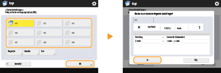 Hvis ovenstående meddelelser vises ved registrering af <Favoritindst.> for <Scan og send>, skal du udføre følgende handlinger. Hvis du vil genkalde favoritindstillinger uden at angive en adgangskode, skal du trykke på <Ja> for at bevare oplysningerne om adgangskoden.