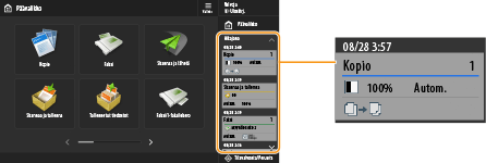 Aikajana on kätevä käyttäjille, jotka haluavat toistuvasti käyttää samoja asetuksia ja vastaanottajia esimerkiksi toiminnoille "Kopio" ja "Skannaa ja lähetä". Käytettyjen asetusten historia lisätään automaattisesti aikajanaan ja samat asetukset voi hakea painamalla niitä.