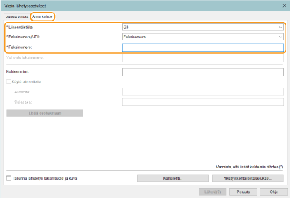 Jos [Vahvista faksinumero/URI kohdetta määritettäessä] on määritetty [Suojausasetukset]-valintaikkunassa, lisää määritetty faksinumero [Vahvista faksinumero] -kohtaan. Tietoja, katso faksiajurin ohje.