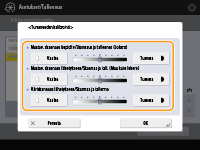 Kun asetus on <Tumma>-puolella, enimmäistummuudella tulostettuja alueita on enemmän. Kun asetus on <Vaalea>-puolella, täytetyt alueet, teksti ja viivat saatetaan tulostaa kuten puolisävyt ja pisteitä voi puuttua. Tätä asetusta tulisi käyttää ensisijaisesti ääripäiden välillä olevan tummuuden säätämiseen.