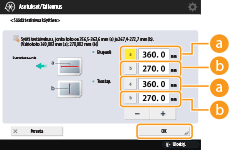 Oletusarvot ovat <a> = 360,0 mm ja <b> = 270,0 mm.