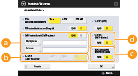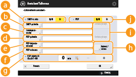 Todennustietojen syöttäminen lähetettäessä: Kun käytetään <Käyttäjänimi>- ja <Salasana>-asetuksia, jotka on määritetty kohdassa <SMTP-autentikointi (SMTP-autent.)>, ja todennusnäyttö (<Kirjaudu SMTP-palvelimelle>) näytetään lähetettäessä
