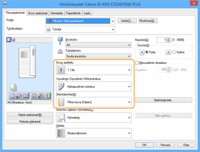 Kun tarkistat tulostuksen esikatselun, määritä [Sivun asettelu] [Sivujärjestys] [1-puolinen/2-puolinen/Vihkotulostus] [Sidontakohta].