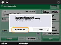 Wanneer meerdere vellen tegelijk worden ingevoerdHet scannen wordt gestaakt en de melding wordt op het scherm weergegeven. Volg de instructies om de opstopping te verwijderen. Als u de opstopping hebt verwijderd wordt het scherm opdracht hervatten weergegeven. Als de machine ten onrechte aanvoering van meerdere vellen detecteert, drukt u op <Aanvoer meerdere vellen niet detecteren> om het scannen te hervatten.