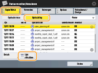 (Statusmonitor) drukt, wordt het scherm Status monitor/Annuleren weergegeven, waarin u de verbruiksgeschiedenis kunt controleren voor elke functie zoals kopiëren, afdrukken, e-mail verzenden, faxen/I-faxen verzenden/ontvangen, bestanden opslaan in ''Geavanceerde ruimte'', enz. Vanuit dit scherm kunt u ook de gebruiksgeschiedenis voor elke functie afdrukken.