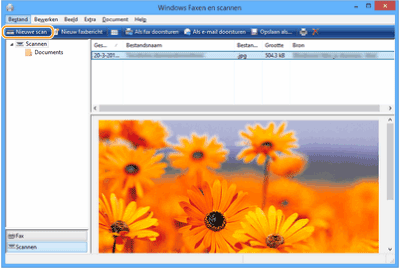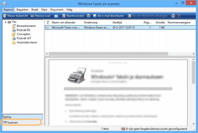 Wanneer het scannen is voltooid, wordt het gescande document op het scherm weergegeven in de lijst met bestanden [Windows Faxen en Scannen] en opgeslagen in de map [Gescande documenten] van [Documenten].
