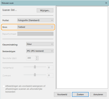 Als u altijd scant met dezelfde instellingen, volgt u onderstaande procedure om de instellingen te registreren. U kunt ze bij het scannen gemakkelijk oproepen. Selecteer [Profiel toevoegen] uit de vervolgkeuzelijst [Profiel]  Geef de scaninstellingen op die u wilt registreren  Voer een naam in het tekstvak [Profielnaam] in  Klik op [Profiel opslaan]