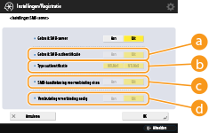 Wanneer <Versleuteling vr verbinding nodig> is ingesteld op <Aan>, kan de machine alleen verbinding maken met SMB-servers die met SMB v3.0 versleutelde communicatie ondersteunt. Wanneer <1.0> en <2.0> zijn ingesteld op <Aan> voor <Geef SMB Client-versie op> maar <3.0> is niet ingesteld op <Aan>, kan de machine geen verbinding maken met SMB-servers die geen ondersteuning bieden voor met SMB v3.0 versleutelde communicatie.