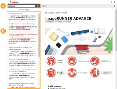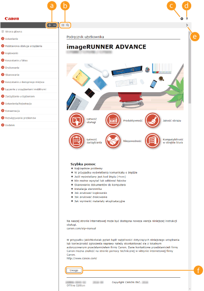 Kliknięcie tego elementu powoduje wyświetlenie instrukcji dotyczących otwierania Podręcznik użytkownika, wyszukiwania oraz innych informacji.