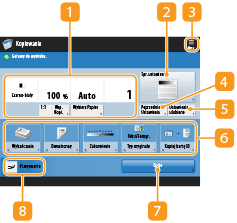 Wyświetla status ustawień, takich jak proporcja kopiowania, format papieru i liczba kopii. Upewnij się, że potwierdzono ustawienia, aby rozpocząć prawidłowy proces kopiowania. Aby zmienić ustawienia, należy nacisnąć na przycisk znajdujący się pod wyświetlaną sekcją. Podstawowe działania związane z kopiowaniem