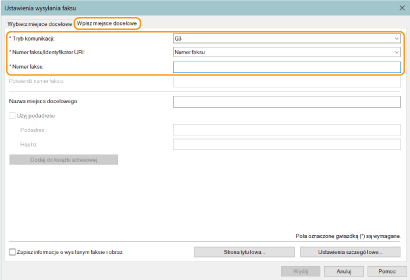 Naciśnij na zakładkę [Wpisz miejsce docelowe] i określ tryb komunikacji i numer wykorzystywanego faksu.
