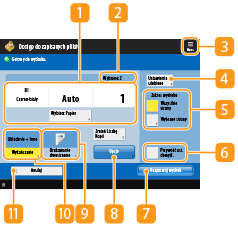 Wyświetla status ustawień, takich jak format papieru do zadrukowania oraz liczbę wydruków. Upewnij się, że potwierdzono ustawienia, aby rozpocząć prawidłowy proces drukowania. Aby zmienić ustawienia, należy nacisnąć na przycisk znajdujący się pod wyświetlaną sekcją. Aby zmienić liczbę wydruków, należy wprowadzić żądaną liczbę za pomocą klawiszy numerycznych.