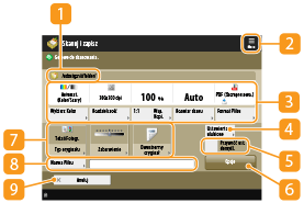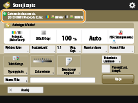 Wyświetla status ustawień, na przykład rozdzielczość, powiększenie i format skanowania. Upewnij się, że potwierdzono ustawienia, aby rozpocząć prawidłowy proces skanowania. Aby zmienić ustawienia, należy nacisnąć na przycisk znajdujący się pod wyświetlaną sekcją. Aby uzyskać informacje na temat formatów plików, patrz