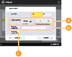 SNTP és un protocol per ajustar l'hora utilitzant un servidor d'hora a la xarxa. SNTP s'utilitza quan cal ajustar l'hora entre l'equip i el servidor en casos en què l'autenticació de seguretat es porti a terme en el moment d'accedir a un servidor LDAP. Establiu la diferència d'hora (zona horària) prèviament perquè les accions es basen en l'hora universal coordinada (UTC). Configuració de la data i l'hora