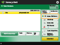 (Seis) ja lähetystöitä on useita, esiin tulee näyttö peruutettavan työn valitsemista varten. Jos lähetystyötä, jonka haluat peruuttaa, ei näy näytössä, valitse <Tarkasta muut työt>, joka näyttää kohdan <Lähetä työt>. Valitse työ, jonka haluat peruuttaa ja paina <Peruuta>.Lähetettyjen asiakirjojen tilan tarkistaminen<Tilavalvonta>-näytössä voit tarkistaa lähetettyjen ja tallennettujen asiakirjojen tilan. Tässä ikkunassa voit lähettää/tallentaa asiakirjat uudelleen tai peruuttaa lähetyksen/tallennuksen tilan tarkistuksen jälkeen. Skannattujen asiakirjojen tilan ja lokin tarkistaminen