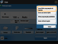 As programações de cópia em cascata guardadas em <Progr. anteriores> ou <Prog. de Favoritos> são substituídas pelas programações de cópia local quando a máquina ou a impressora de cópia em cascata é reiniciada. Se quiser chamar <Progr. anteriores> e efetuar cópias em cascata, ligue a impressora e atualize as informações sobre a impressora de cópia em cascata decorrido o tempo programado em <Tempo de espera para ligação no arranque>. <Intervalo p/transmissão cópia em cascata>