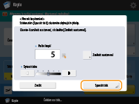 Stisknutím <Spustit tisk> spusťte tisk zadaného počtu kopií. Jestliže jste v kroku 5 vybrali <Všechny strany>, vytiskne se počet kopií bez jedné kopie. Jestliže jste v kroku 5 vybrali <Zadané strany>, vytiskne se celý počet kopií.