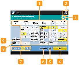 Zde se zobrazuje stav nastavení, např. poměr kopírování, velikost papíru, počet kopií atd. V zájmu správného zhotovení kopií nastavení zde vždy zkontrolujte. Chcete-li nastavení změnit, stiskněte tlačítko pod zobrazením.