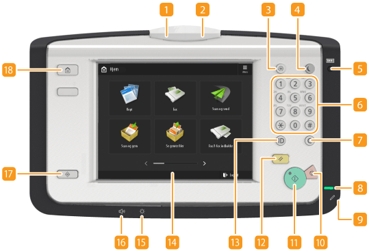 Blinker, når der udføres betjeninger som f.eks. afsendelse eller udskrivning. Lyser grønt, når dokumenter venter på at blive behandlet.