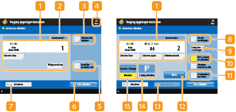Geeft instellingenstatus weer, zoals het papierformaat om op af te drukken en het aantal afdrukken. Controleer de instellingen om goed te kunnen afdrukken. Om de instellingen te wijzigen, drukt u op de knop onder het weergavegedeelte. Om het aantal afdrukken te wijzigen, voert u met de numerieke toetsen het aantal in.