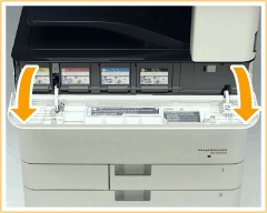 Subjecteu els costats dret i esquerre de la tapa de canvi de tòner i estireu la tapa cap a on sou per obrir-la. S'obrirà la tapa de canvi (tapa petita) de la ranura corresponent al tòner que cal substituir.