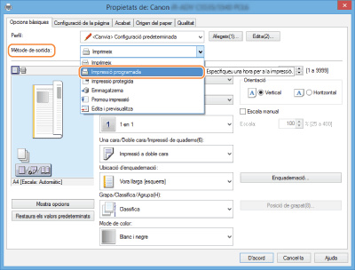 Podeu establir una hora per començar a imprimir, la qual cosa és útil quan s'imprimeixen grans quantitats de documents a la nit, etc.