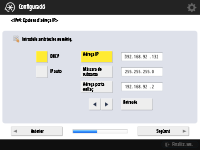 Per establir l'adreça IP manualment, esborreu la selecció de <DHCP> o <IP auto>, premeu <Adreça IP>, <Màscara de subxarxa> i <Adreça porta enllaç> per introduir cada valor i premeu <Següent> o <Acceptar>.