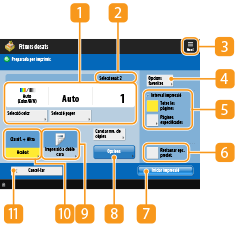 Mostra l'estat de l'opció, com la mida de paper per imprimir i el nombre d'impressions. Assegureu-vos de confirmar les opcions per imprimir correctament. Per modificar les opcions, premeu el botó que hi ha a sota de la secció de la pantalla. Per canviar el nombre d'impressions, introduïu el nombre amb les tecles numèriques.