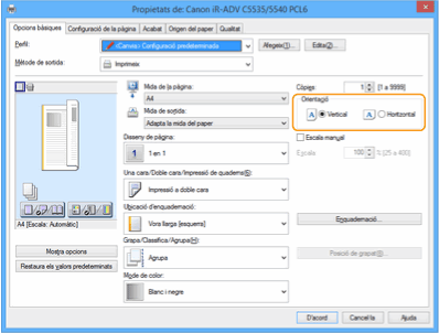 [Ordre de pàgines] [Una cara/Doble cara/Impressió de quaderns] [Ubicació d'enquadernació].