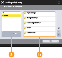 (Indstillinger/Registrering) for at få vist <Indstillinger/Registr.>-skærmen. Tryk først på denne tast for at udføre ændringer for hver indstilling, som f.eks. indstillinger for papir, display og netværk. På dette skærmbillede kan du også registrere modtagere, som f.eks. e-mailadresser og faxnumre.