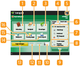 Viser indstillingsstatus, som f.eks. opløsningen og filformater. Sørg for at tjekke indstillingerne for at scanne korrekt. For at ændre indstillingerne skal du trykke på den ønskede knap.