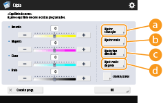Ajusta a densidade de amarelo, magenta, ciano ou preto separadamente. Também pode especificar a intensidade e o tom para efetuar o ajuste fino da cor.