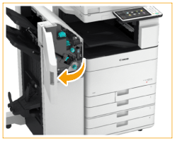 Empurre a unidade de finalização-agrafamento para dentro e feche a tampa da frente do finalizador.