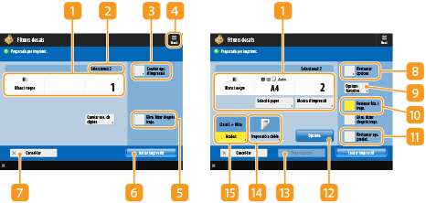 Mostra l'estat de l'opció, com la mida de paper per imprimir i el nombre d'impressions. Assegureu-vos de confirmar les opcions per imprimir correctament. Per modificar les opcions, premeu el botó que hi ha a sota de la secció de la pantalla. Per canviar el nombre d'impressions, introduïu el nombre amb les tecles numèriques.