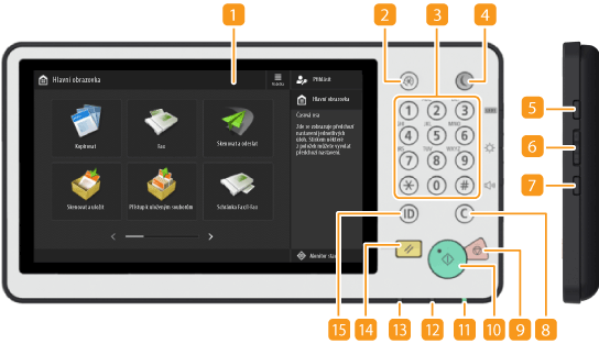 Když je třeba provádět autentizaci uživatele, stiskněte toto tlačítko, abyste se přihlásili do systému stroje. Po ukončení práce na stroji opětovným stisknutím tohoto tlačítka proveďte odhlášení ze systému stroje.