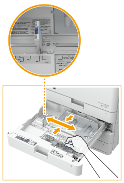Druk op het bovenste gedeelte van de voorste geleider en verschuif hem zodat die op een lijn met de formaatindicator voor het te plaatsen papier.