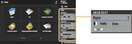 De tijdlijn is handig voor gebruikers die herhaaldelijk dezelfde instellingen en bestemmingen gebruiken voor een functie zoals "Kopie" en "Scannen en verzenden". De geschiedenis van gebruikte instellingen wordt automatisch toegevoegd aan de tijdlijn en kan worden geselecteerd om dezelfde instellingen op te roepen.