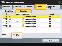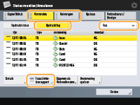 (Statusmonitor) drukt, wordt het scherm Status monitor/Annuleren weergegeven, waarin u de verbruiksgeschiedenis kunt controleren voor elke functie zoals kopiëren, afdrukken, e-mail verzenden, faxen/I-faxen verzenden/ontvangen, bestanden opslaan in ''Geavanceerde ruimte'', enz. Vanuit dit scherm kunt u ook de gebruiksgeschiedenis voor elke functie afdrukken.