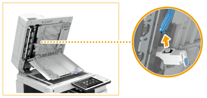 De machine heeft een functie voor het stempelen van originelen die met de aanvoer zijn gescand, om aan te geven dat ze al zijn gescand. Dit stempel is een verbruiksmateriaal. Als het stempel zwakker wordt, vervangt u de stempelcartridge die aan de aanvoer is bevestigd.