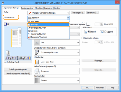 Selecteer [Bewaren] at [Uitvoermodus].