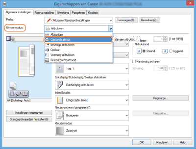Als u de functie voor geplande afdruk wilt gebruiken, moet u <Geforceerd in de wachtrij> vooraf instellen op <Uit>. <Geforceerd in de wachtrij>
