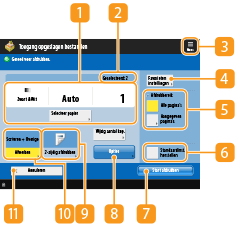Geeft instellingenstatus weer, zoals het papierformaat om op af te drukken en het aantal afdrukken. Controleer de instellingen om goed te kunnen afdrukken. Om de instellingen te wijzigen, drukt u op de knop onder het weergavegedeelte. Om het aantal afdrukken te wijzigen, voert u met de numerieke toetsen het aantal in.