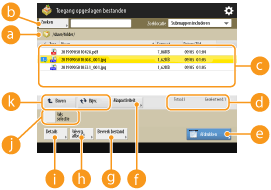 Geeft weer of bestanden of mappen zijn geselecteerd, en pictogrammen die het bestandstype of de map, namen, bestandsgroottes en data/tijden van opslag aangeven.