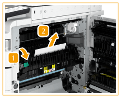 Als papier is vastgelopen in het tweede uitvoergebied, trekt u dit voorzichtig naar buiten in de richting van de pijl.