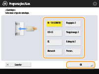 Se programar <Especificar sempre> em <Pré-programações tabuleiro multifunções> para <Papel favorito>, aparece um ecrã que permite selecionar o seu "Papel favorito" quando colocar papel no tabuleiro multifunções. <Pré-programações tabuleiro multifunções>