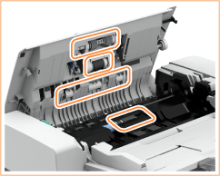 Hvis der stadig er striber på originalerne eller papiret, efter at fremføreren er blevet rensetLæg ca. 10 ark i A4-format i fremføreren, og følg denne fremgangsmåde for at udføre <Rens fremfører>. Når der vises en meddelelse, der angiver, at rengøringen er færdig, skal du prøve at bruge fremføreren til at kopiere en original for at kontrollere, om problemet er blevet løst.