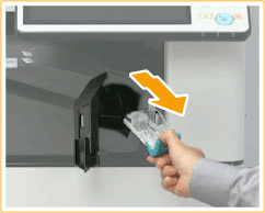 Steek de plaat die uitsteekt van de voorkant van de nietpatroon in de nietpatroonhouder en laat de nietpatroon zakken om deze in de nietpatroonhouder te plaatsen.